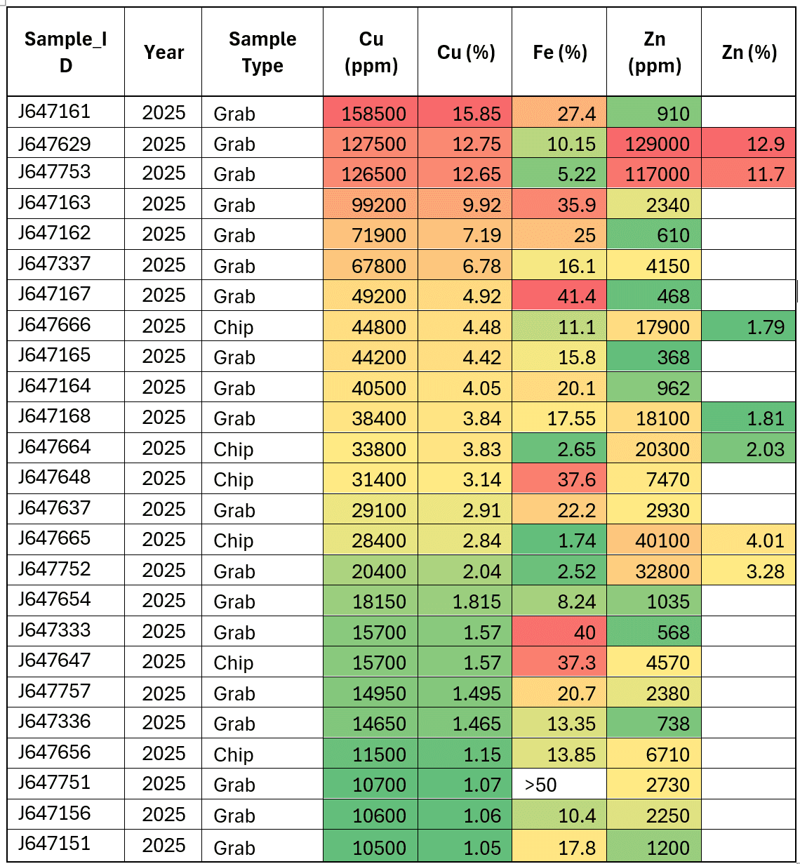 126 surface rock samples collected, including 25 samples exceeding 10,000 ppm (1% Cu).